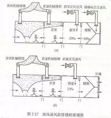 机械加压送风排烟系统主要由送风口、送风管道、送风机和风机控制柜等组成。机械防烟是在疏散通道等需要防烟的部位送入足够的新鲜空气,使其维持高于建筑物其他部位的压力,从而把着火区域所产生的烟气堵截于防烟部位之外。