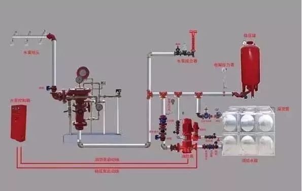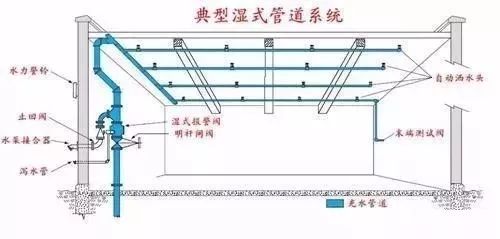 由湿式报警阀组、闭式喷头、水流指示器、控制阀门、末端试水装置、管道和供水设施等组成。系统的管道内充满有压水,一旦发生火灾,喷头动作后立即喷水。