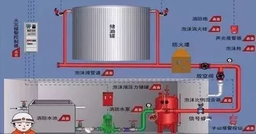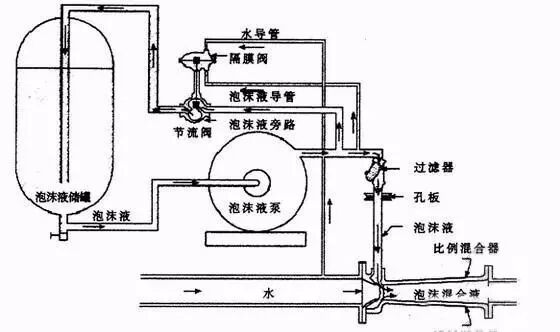 喷射泡沫灭火剂的固定消防炮系统,主要由水源、泡沫液罐、消防泵组、泡沫比例