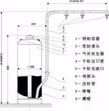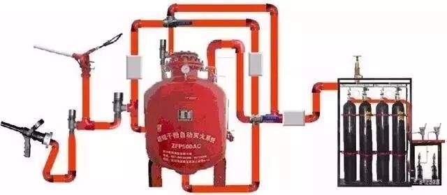 粉灭火系统由干粉供应源通过输送管道连接到固定的喷嘴上,通过喷嘴喷放干粉的灭火系统。