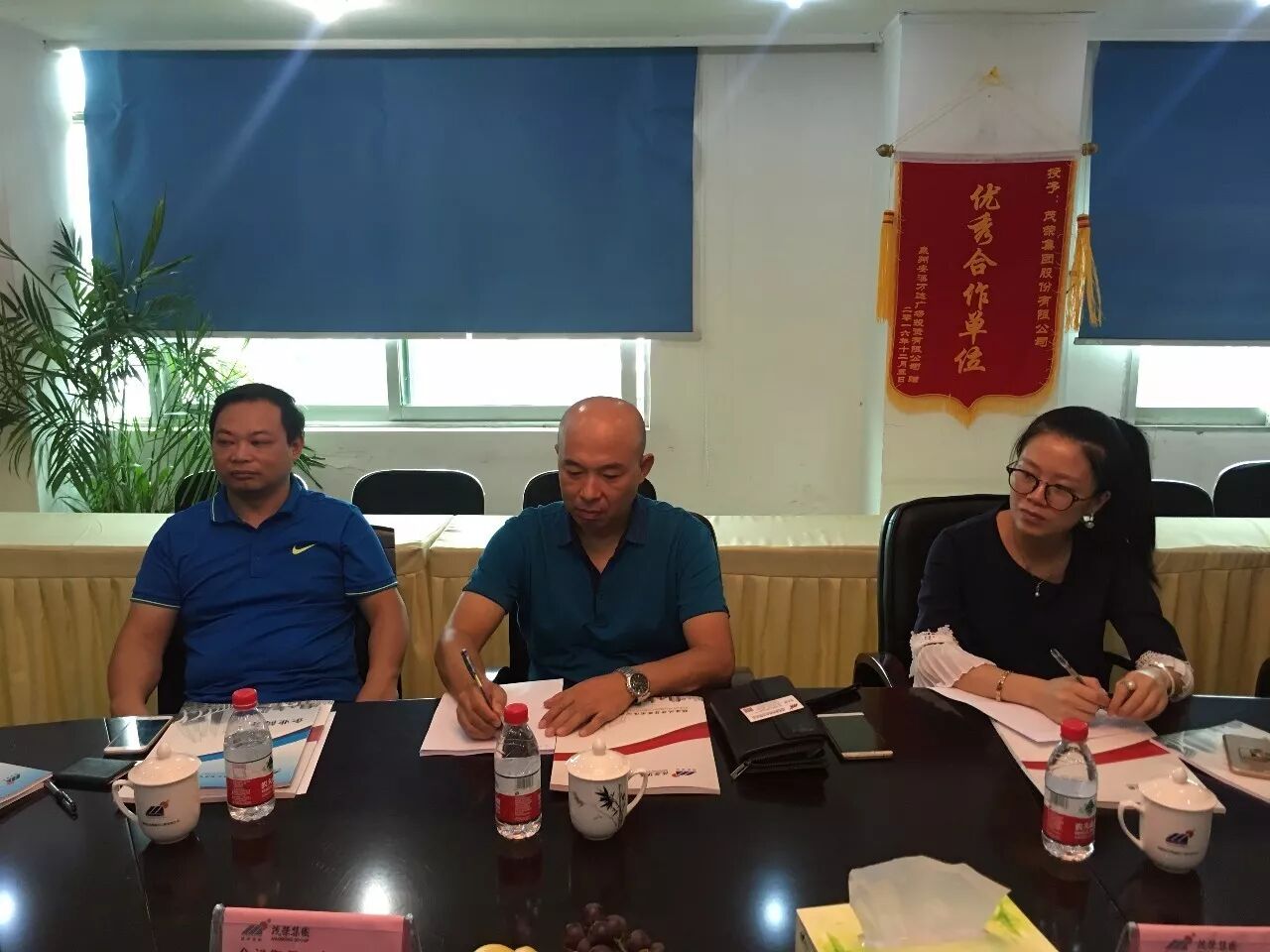 2017年10月20日下午,华侨大学经济与金融学院黄建烽书记、王景河教授一行莅临我司指导工作。在茂荣集团董事长余茂清先生、总经理王火花女士的陪同下,与黄建烽书记、王景河教授一行在会议室观看了我司集团宣传片,并为我司进一步发展提出了许多建设性意见。